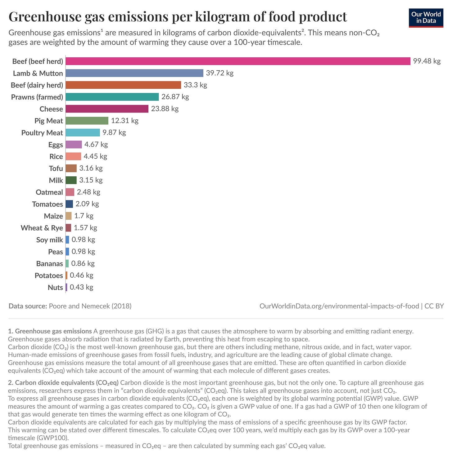 Matvælaframleiðsla er ábyrg fyrir um fjórðungi af allri losun gróðurhúsalofttegunda. Hér er uppskiptingin aftur mjög upplýsandi því 53% losunar vegna matvælaframleiðslu má rekja til framleiðslu dýraafurða á meðan 29% má rekja til framleiðslu afurða úr jurtaríkinu til manneldis. Þau 18% sem eftir standa má síðan rekja til annara þátta í virðiskeðju matvæla svo sem umbúðaframleiðslu og matvælaflutninga.