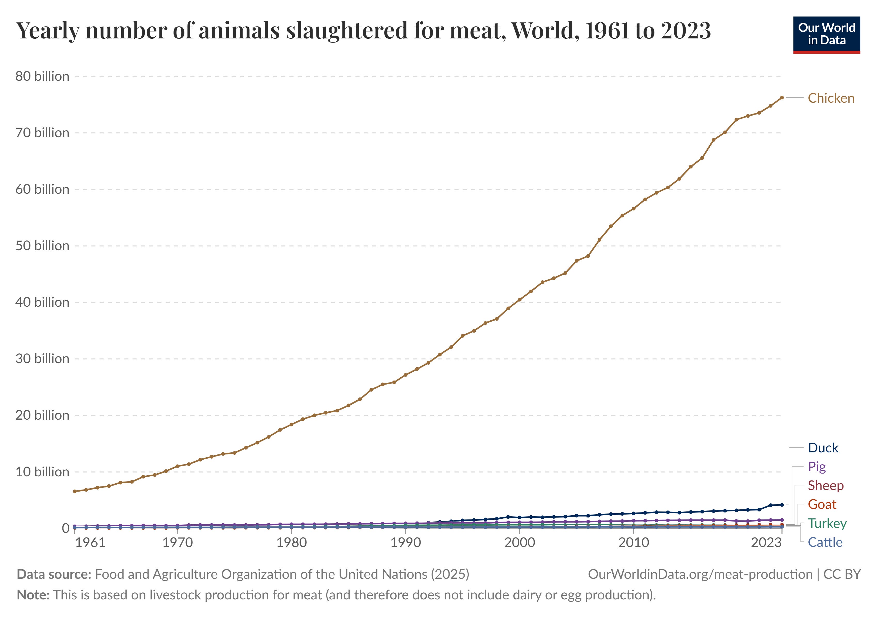 Frekar en að horfa á hlutfall húsdýra og villtra dýra getur verið gagnlegra að horfa á fjölda húsdýra sem er slátrað árlega. Fjöldi nautgripa sem er slátrað árlega er um 910 milljónir, fjöldi kinda og geita samanlagt um 1,2 milljarðar, fjöldi svína um 1,5 milljarðar og fjöldi kjúklinga hvorki meira né minna en 76 milljarðar. Heildarfjöldi dýra sem er slátrað á hverju ári er 85 milljarðar. Til samanburðar er fjöldi fólks á jörðinni ca. 8 milljarðar.